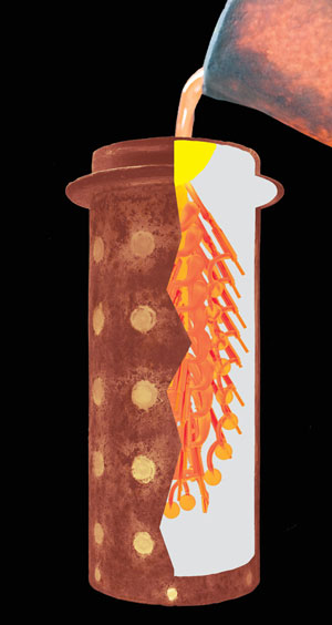 Durch das Ausschmelzen des Wachses und dem Brennen der Einbettmasse entstehen sog. Hohlformen. In diese wird das flüssige Metall eingegossen. So entsteht der sog. Gussbaum. Daher wird dieser Prozess auch als Wachsausschmelzverfahren bezeichnet.